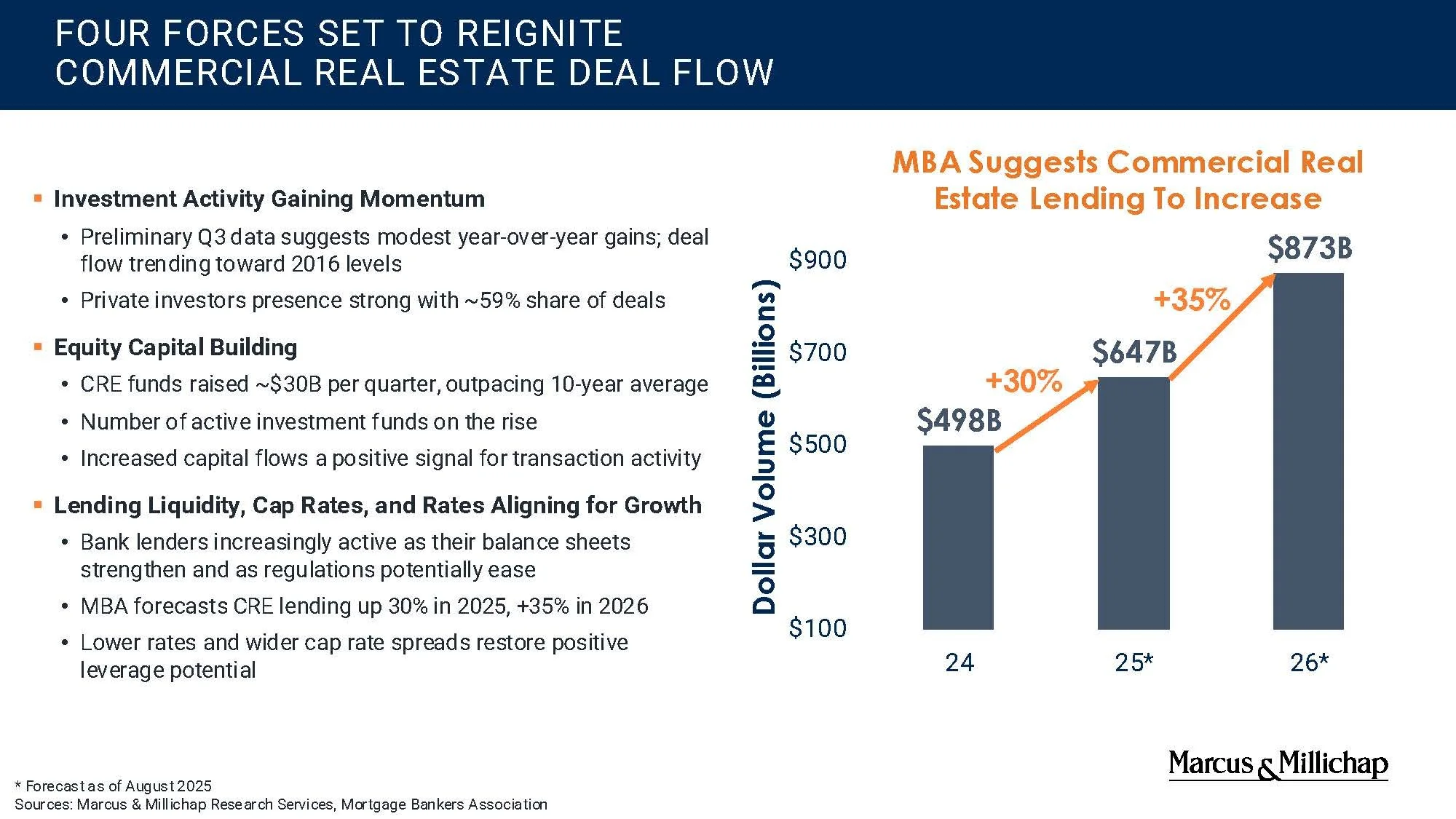 The Mortgage Bankers Association forecasts CRE lending to rise roughly 30% in 2025 and another 35% in 2026, signaling that liquidity is returning to the debt markets.